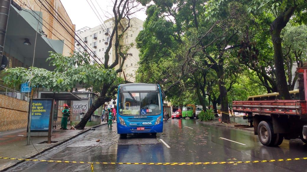Uma árvore de grande porte caiu sobre um ônibus na Avenida do Contorno, altura do número 1.413, no bairro Floresta.