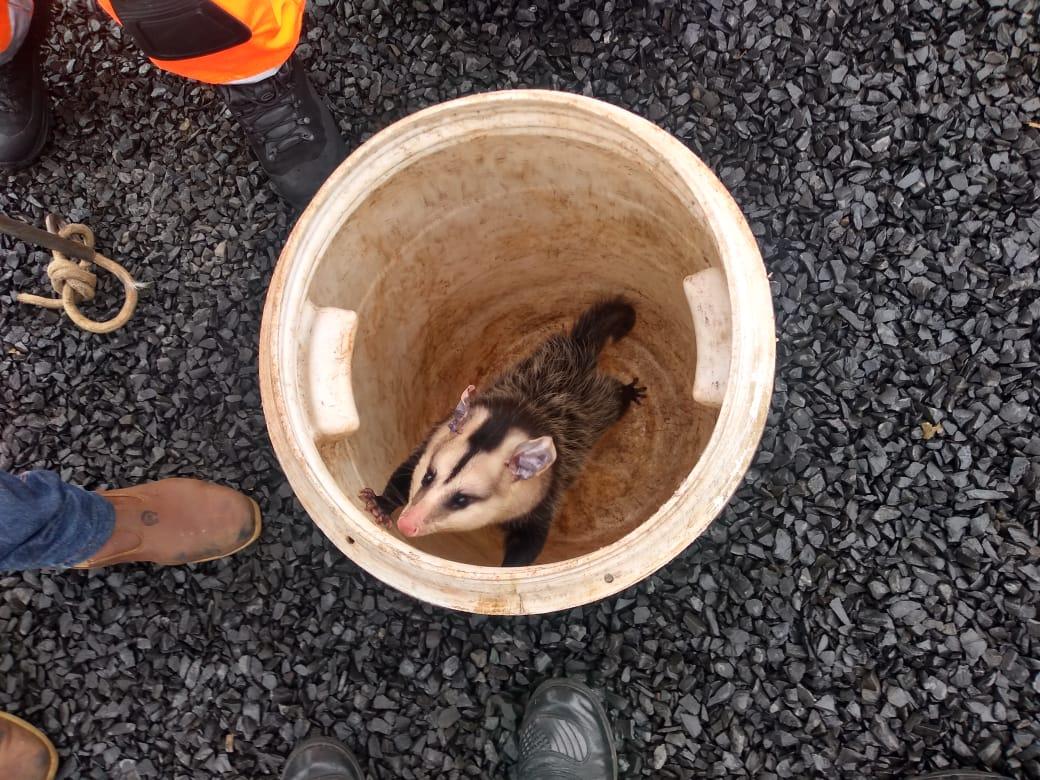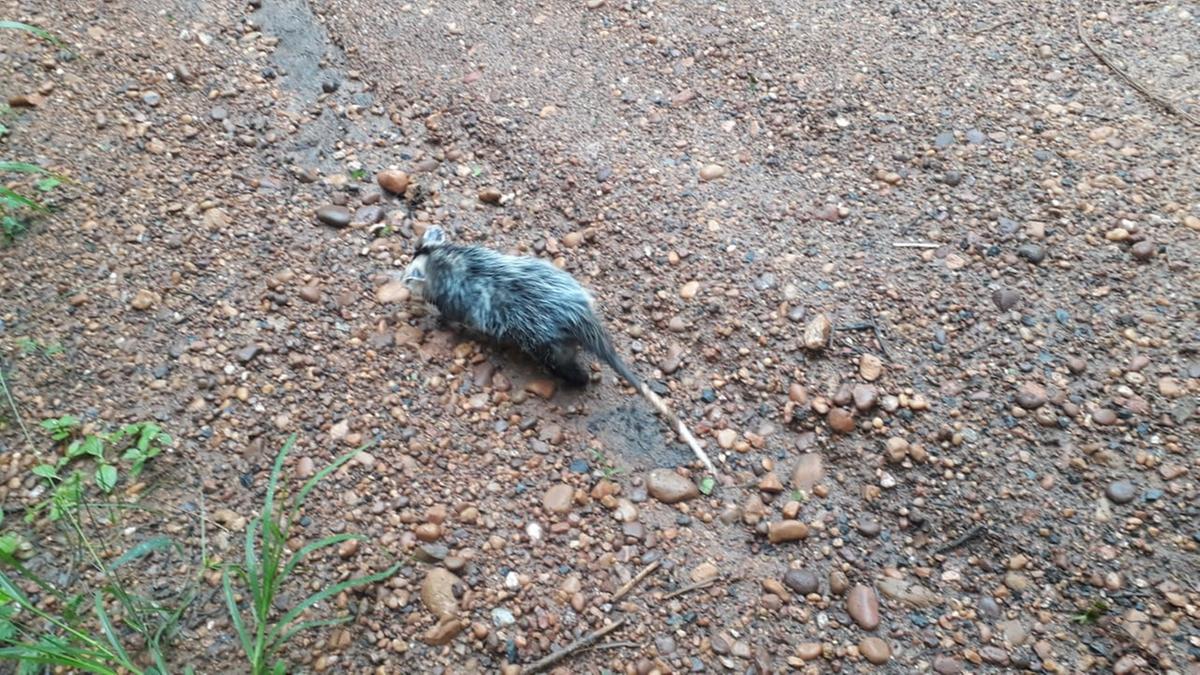 O animal foi capturado e solto, juntamente com seus filhotes, que estavam na bolsa marsupial, em uma mata próxima.