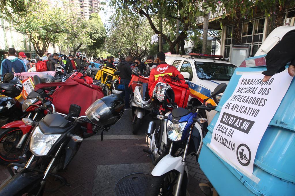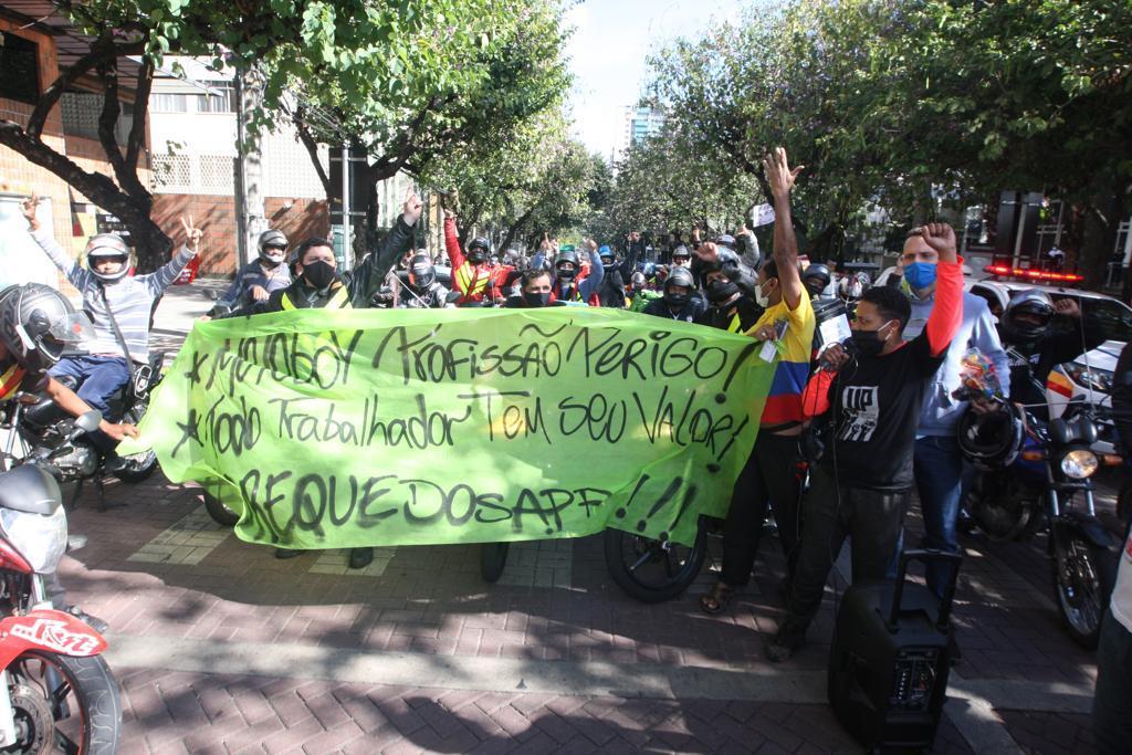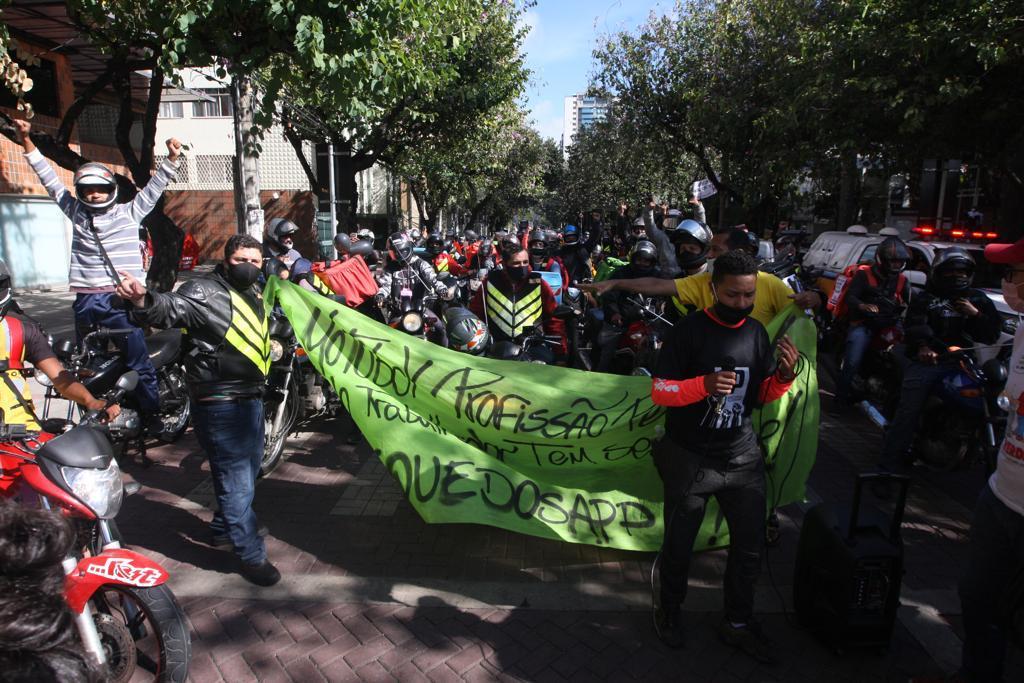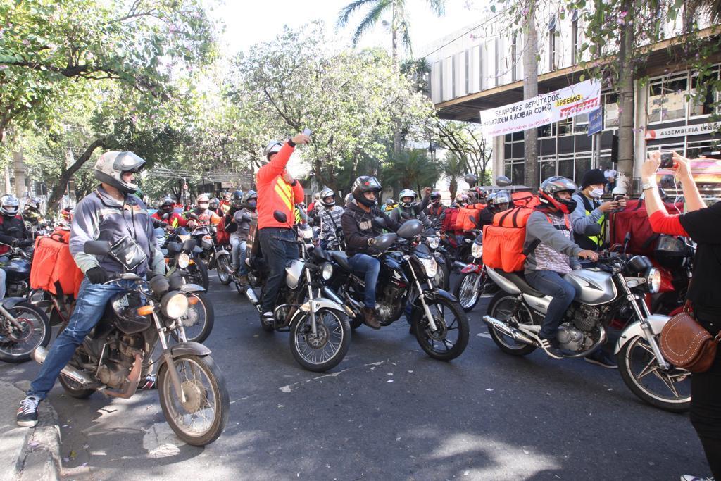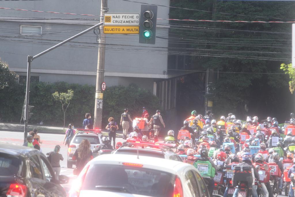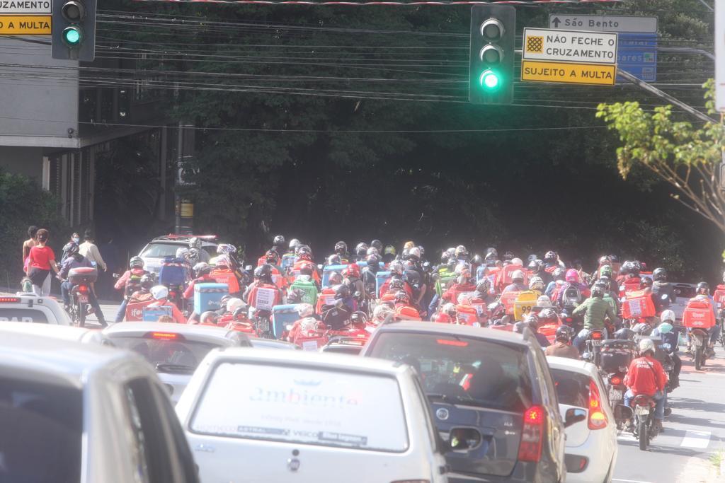 Um grupo grande de motoboys e entregadores se reuniu no início da manhã na praça da Assembleia, região Centro-Sul, e saíram protestando pelas ruas da região central da cidade.
