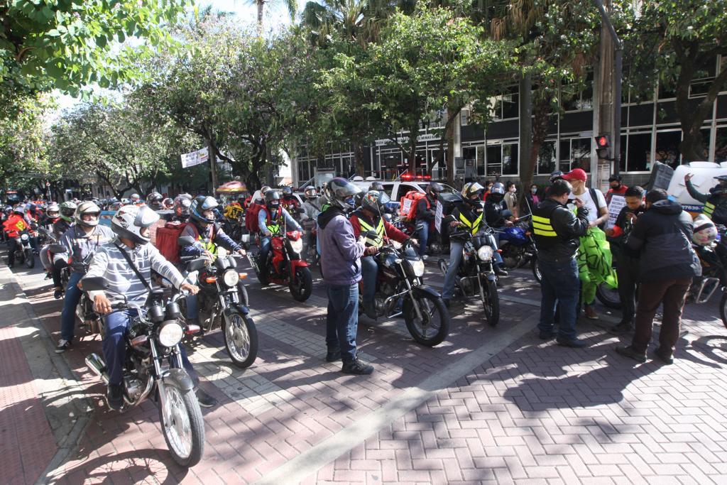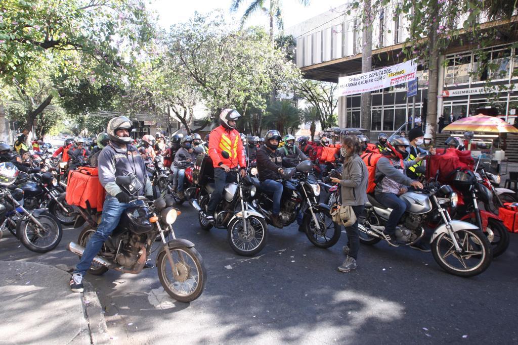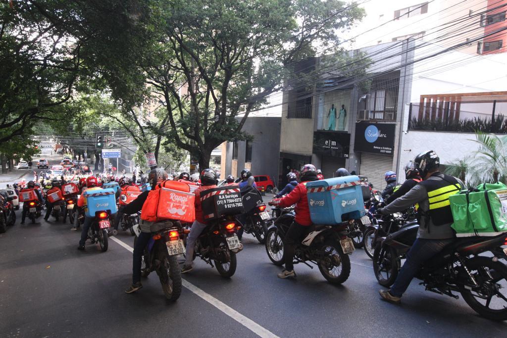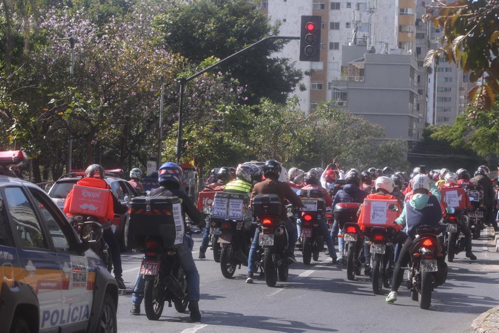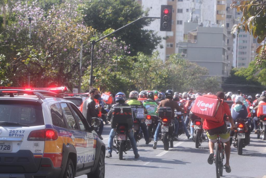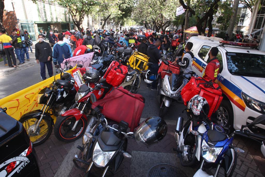 Um grupo grande de motoboys e entregadores se reuniu no início da manhã na praça da Assembleia, região Centro-Sul, e saíram protestando pelas ruas da região central da cidade.