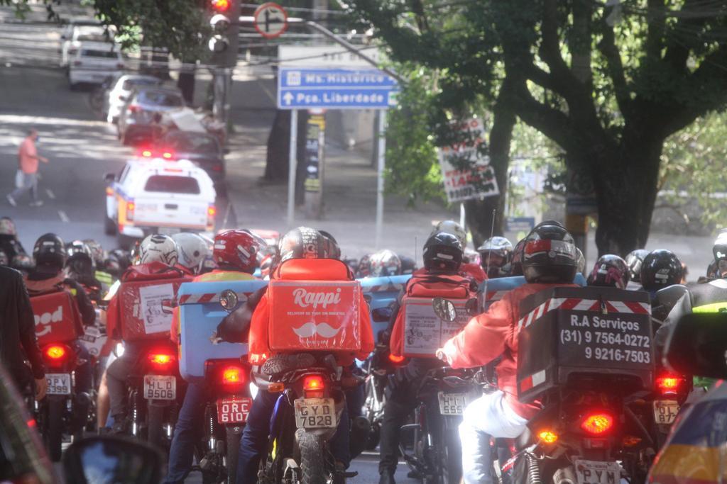 Motoboys e entregadores de aplicativos protestam pelas ruas do Centro de Belo Horizonte nesta quarta-feira (1º) exigindo melhor remuneração e segurança. A iniciativa foi articulada por meio de grupos de Whatsapp e sem lideranças ligadas a sindicatos, por exemplo – nos moldes da greve dos caminhoneiros, que parou o país em maio de 2018. Os alvos dos protestos são aplicativos como iFood, Uber Eats e Rappi.