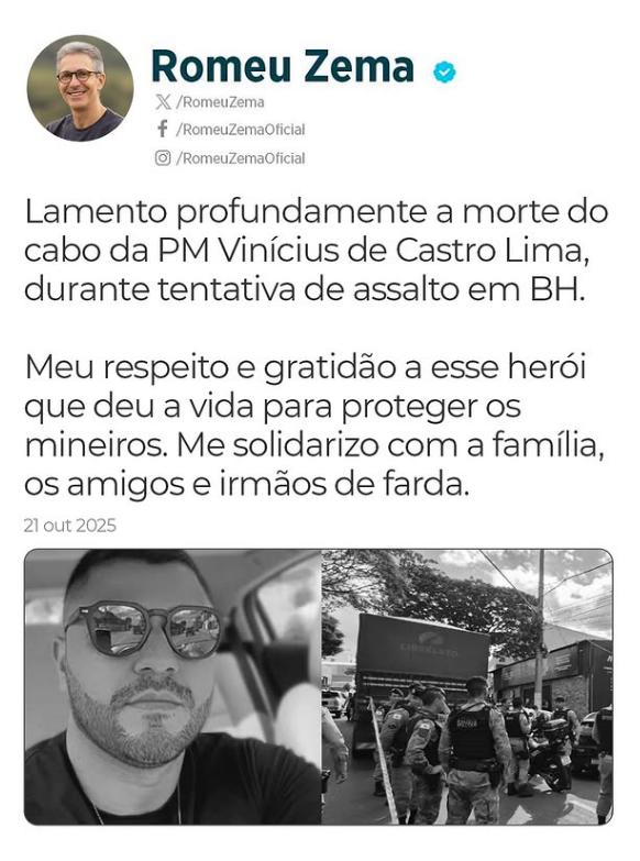 O cabo Vinícius de Castro Lima estava em seu primeiro dia de férias e havia acabado de almoçar com amigos antes de ser atingido pelos disparos. Ele era amigo do dono do estabelecimento alvo do roubo. Segundo o tenente-coronel Gláuber Paixão Emídio, comandante do 39º Batalhão da PMMG, o militar tentou reagir à ação criminosa, mas foi atingido e morreu no local. O cabo Castro, que fazia parte do Tático Móvel, era muito bem quisto no batalhão, onde tinha oito anos de serviço.