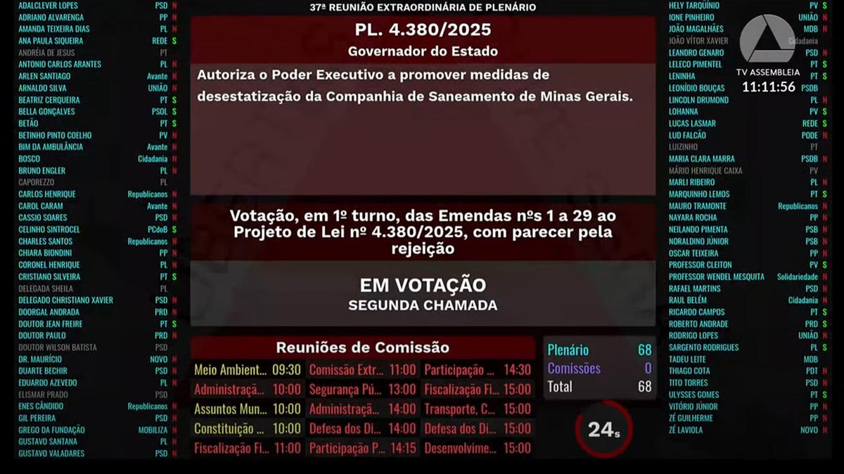 A Assembleia Legislativa de Minas Gerais (ALMG) aprovou, na manhã desta terça-feira (2), em primeiro turno, o projeto de lei que autoriza a privatização da Companhia de Saneamento de Minas Gerais (Copasa). A proposta recebeu 50 votos favoráveis e 17 contrários no Plenário, consolidando a vitória do governo Zema, que tratava o tema como prioridade.