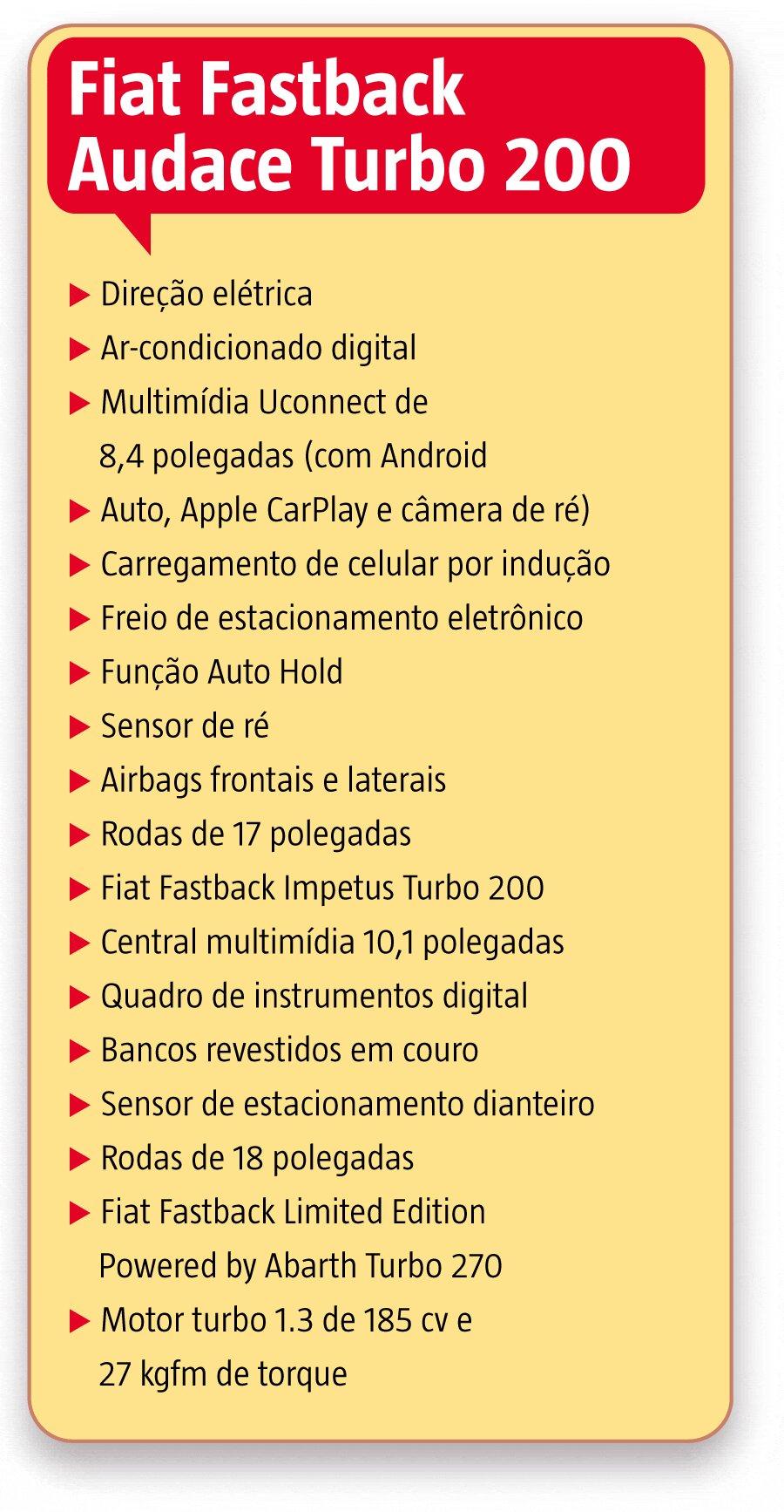 Não adianta ser bonito e não ter conteúdo. Nas clínicas e pesquisas produzidas pelo time de marketing da Fiat foram listados itens mais requisitados pelos consumidores. E se a marca queria fazer com que o Fastback se tornasse referência, era necessário um pacote farto desde a versão de acesso.